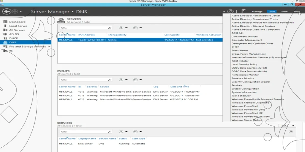 - پس از نصب، از طریق Server Manager → Tools → DNS وارد کنسول DNS Manager شوید.